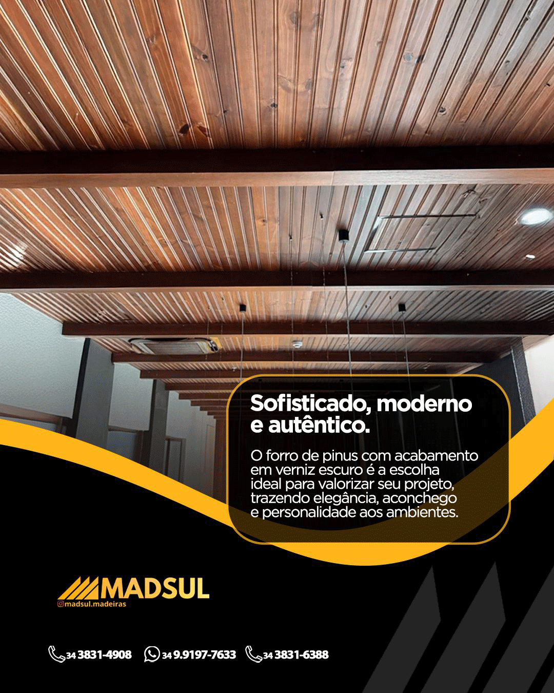 O forro de pinus com acabamento em verniz escuro transforma qualquer espaço e entrega um acabamento impecável do início ao fim.