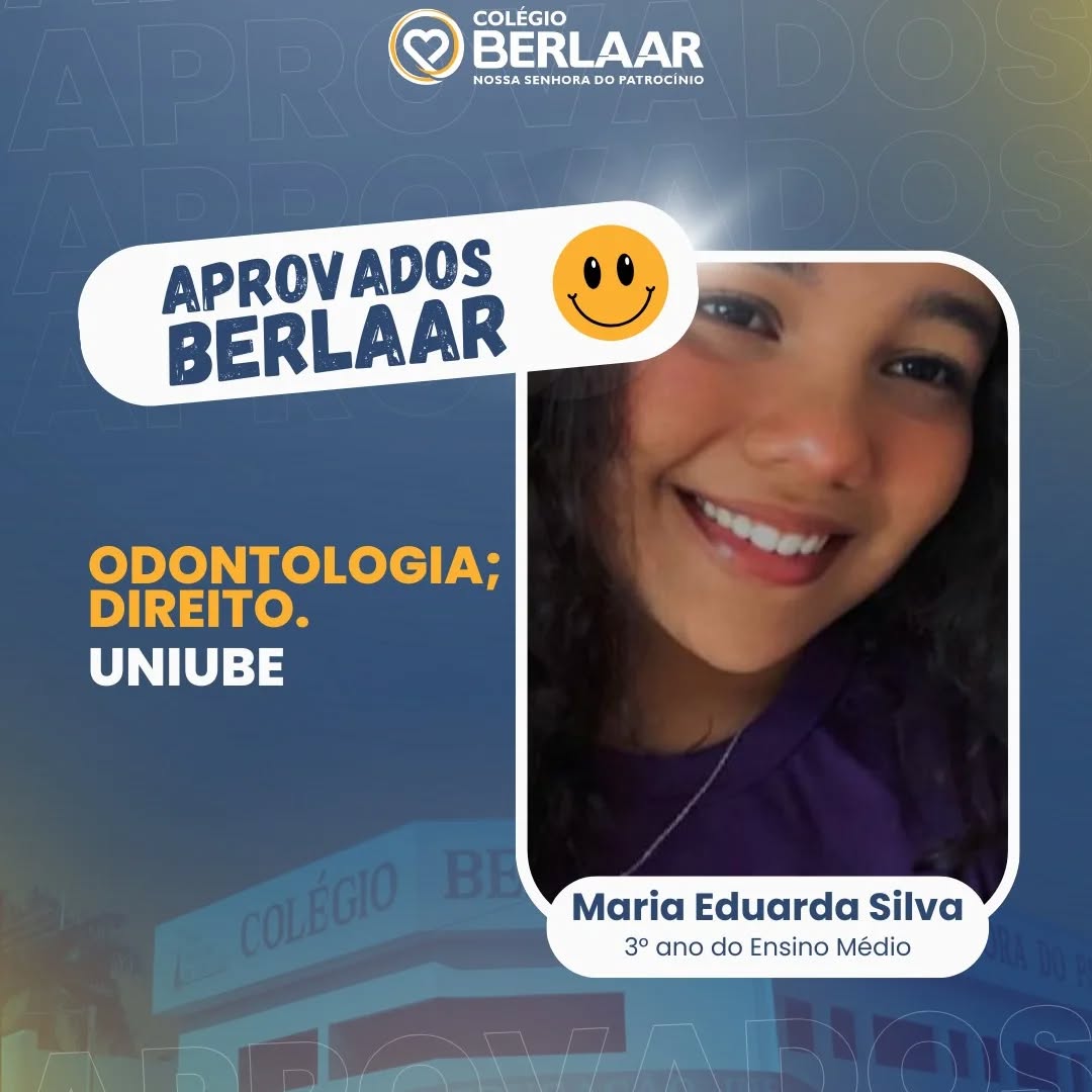 Maria Eduarda escreveu uma história bonita no Colégio Berlaar, e agora começa a escrever outras duas. Ser aprovada em Odontologia e Direito na UNIUBE mostra a força de quem acredita no próprio potencial, se dedica com consciência e transforma sonhos em direção.