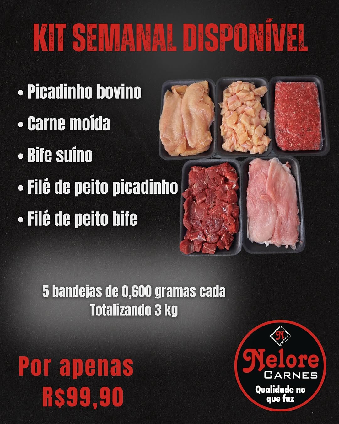 5 bandejas de 600g cada, totalizando 3kg.