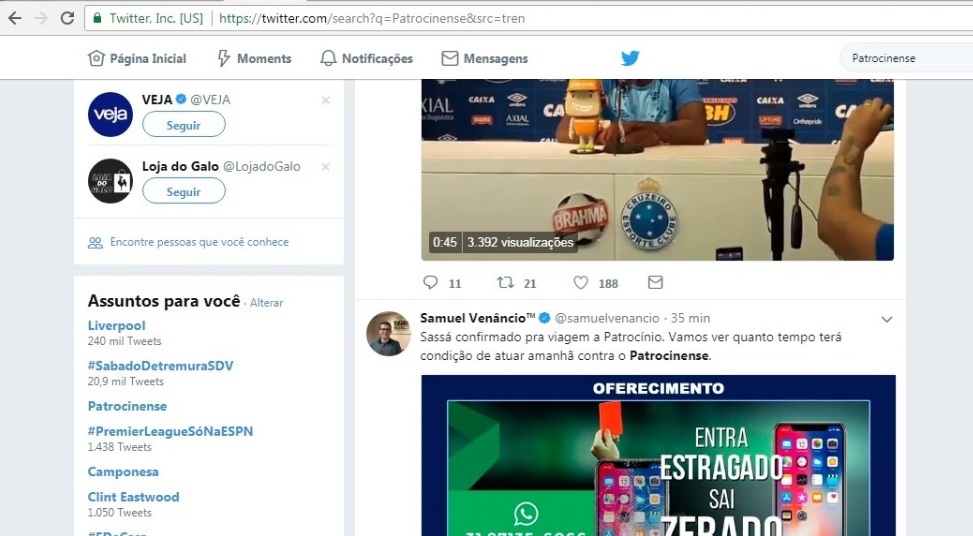 Um dos links do Twitter mais comentados neste sábado, 10/03, foi uma entrevistada do jogador Sassá, ex-Botafogo, atualmente no Cruzeiro, que fala do jogo contra a Patrocinense.