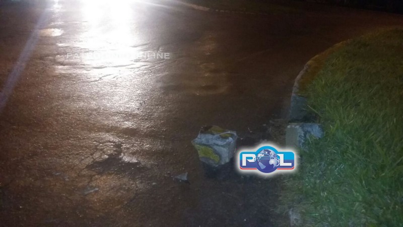 E o veículo ao fazer rotatória tentou desviar da pedra subindo na Rotatória e o veículo quase capotando lado direito.