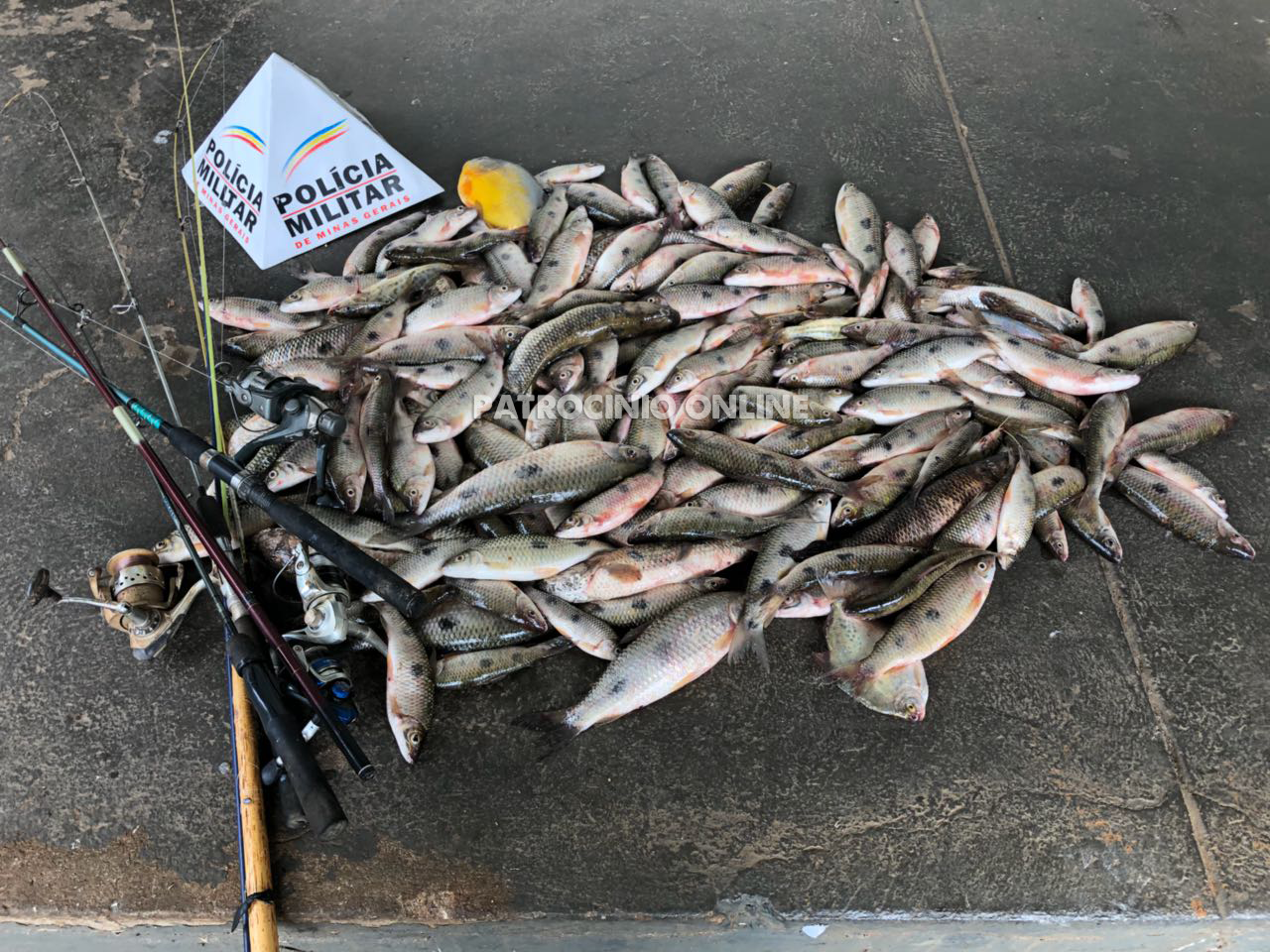 PATROCÍNIO (MG) - Neste período de Piracema em atendimento a denúncia de pesca predatória no lago da UHE de Nova Ponte próximo ao Rancho dos Treze, no município de Patrocínio, uma equipe da Polícia Militar do Meio Ambiente compareceu no local onde deparou três pescadores amadores em um tablado às margens do lago de Nova Ponte praticando a pesca utilizando caniços de fibra e molinetes de pesca.
