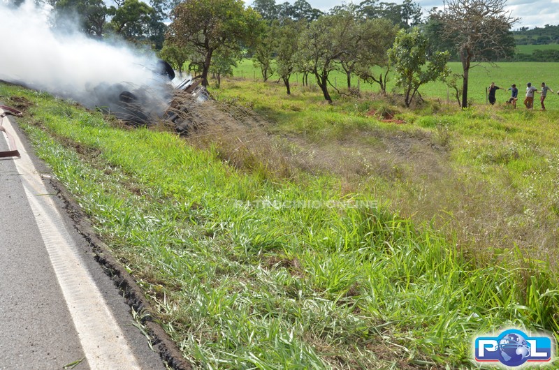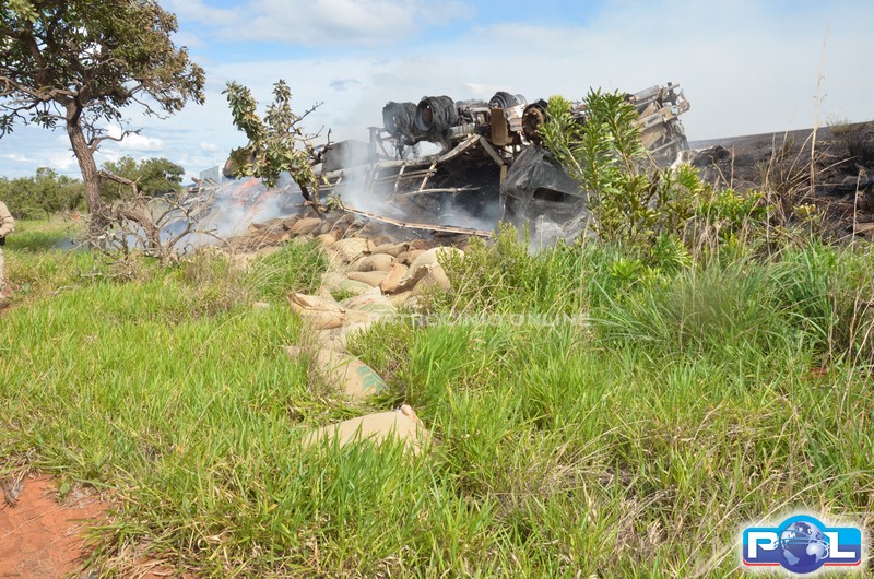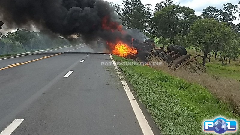 Uma carreta carregada de café pegou fogo na BR-365, após o condutor perder o controle do veículo e capotar na pista, na tarde desta quarta-feira (30/11).