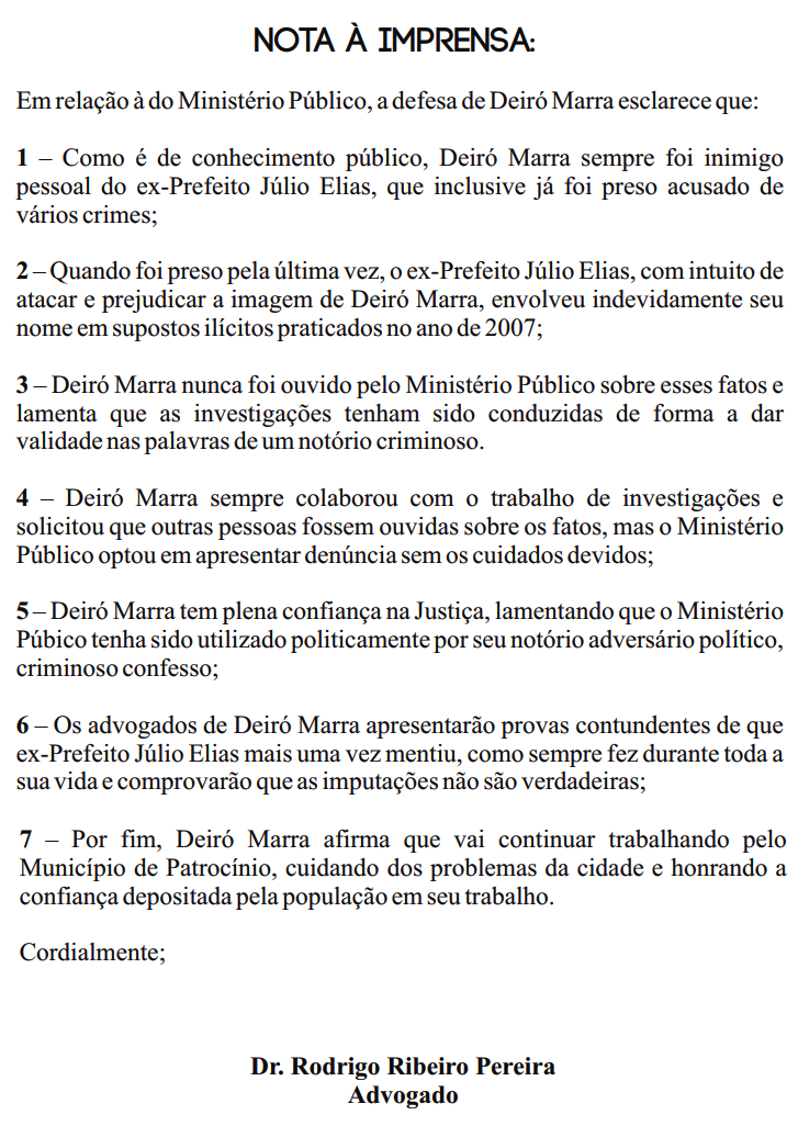 Mais uma vez o Prefeito de Patrocínio Deiró Marra, esclareceu através de nota que as acusações de Júlio Elias relativas ao processo de licitação do transporte público ocorrido em 2007, quando Júlio era prefeito da cidade, são todas mentirosas e demonstra que tais informações serão novamente desmentidas em sede do processo deflagrado pelo Ministério Público.