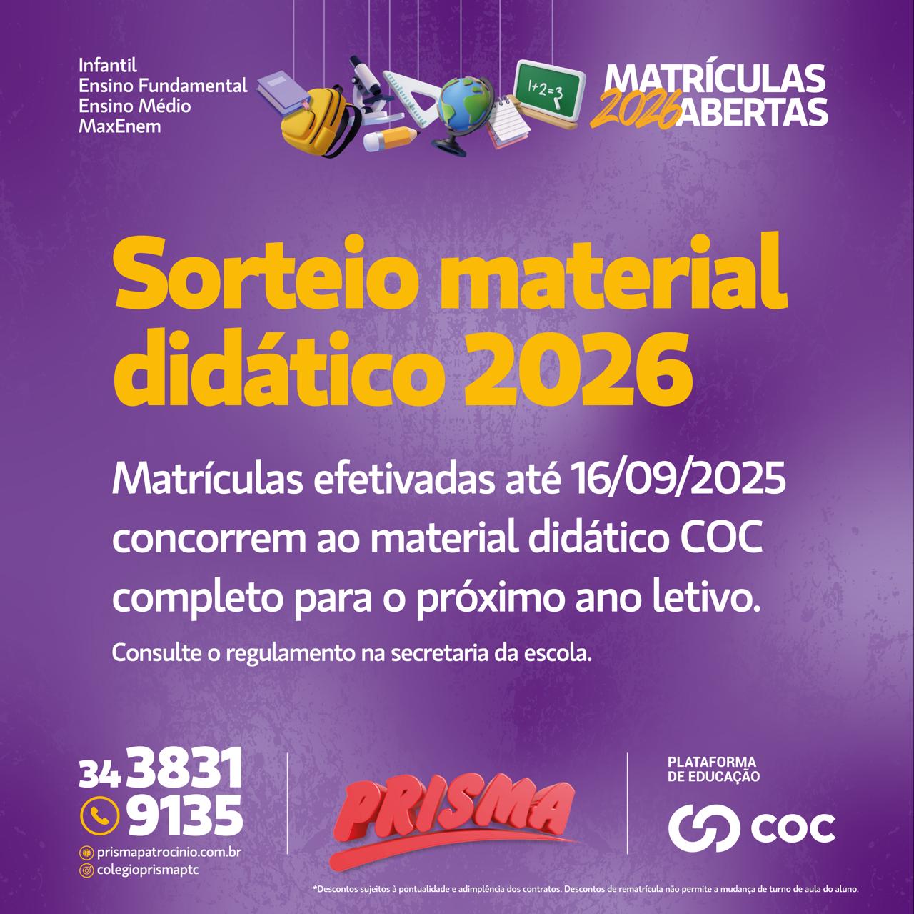 Os alunos que garantirem sua matrícula até 16/09/2025 concorrem ao sorteio do material didático completo COC 2026.