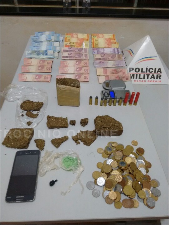 Diante de novas denúncias recebidas pelo rádio operador da Sala de Operação da Cia PM sobre tráfico de drogas ocorrendo no local e a existência de uma arma de fogo, foi feito contato com senhora M.L.M., 63 anos que negou o envolvimento com o tráfico e franqueou a entrada e buscas na residência, quando os militares encontraram 42 pedras de crack e 01 papelote de crack moído, 01 papelote de cocaína, R$551,90 em moedas e notas diversas, 10 munições de calibres diversos, maconha em tabletes e buchas, 02 duas balanças de precisão, 03 telefones celulares, 01 rádio automotivo, 01 aparelho DVD, todos apreendidos.