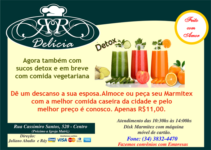 Dê um descanso a sua esposa.Almoce ou peça seu Marmitex com a melhor comida caseira da cidade e pelo melhor preço é conosco. Apenas R$11,00. Entregas são feitas em domicílio.