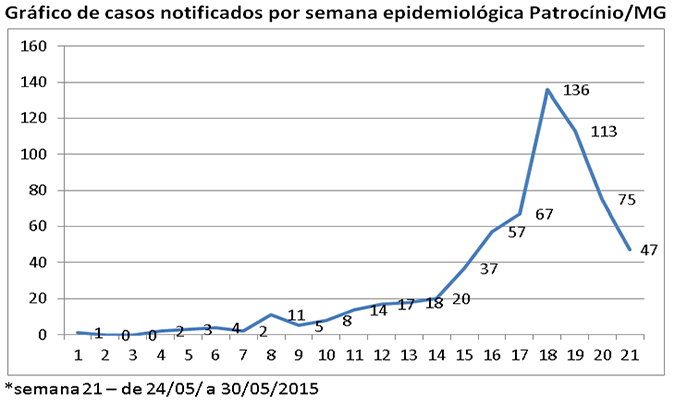 Às quintas-feiras, a Secretaria Municipal de Saúde atualização às informações sobre os casos confirmados de dengue e o número de notificações apresentadas no município. Até o dia 28 de maio, foram registradas 637 notificações de Dengue em Patrocínio no ano de 2015. Conforme o gráfico, a semana epidemiológica 18 (do dia 03 a 09/05) foi a que teve o maior número de casos notificados no ano. No entanto, já pela terceira semana consecutiva, observa-se uma redução no número de notificações, conforme previsto.