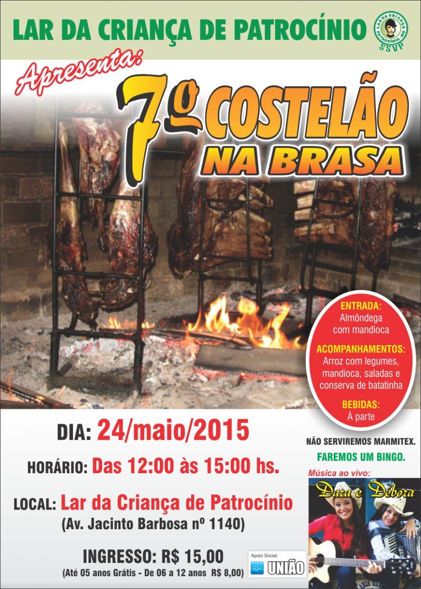 Foi para auxiliar nos projetos da entidade que surgiu o "COSTELÃO NA BRASA" já na sua 7ª edição. Não deixe de prestigiar. (confirme no cartaz ao lado) Será dia 24/maio/2015, da 12 ás 15:oo na sede do Lar da Criança. Valor do ingresso R$15,00 para adulto e R$8,00 para crianças de 06 a12 anos, menores de 05 anos não pagam. Animação musical por conta de "Dara e Débora" O cardápio terá além da costela assada, arroz com legumes, mandioca, saladas e conserva de batatinha. Os participantes poderão comer a vontade, mas não será servido marmitex. Mais informações na sede do Lar da Criança, na Avenida Jacinto Barbosa nº 1140 ou pelo telefone 3831- 4517.