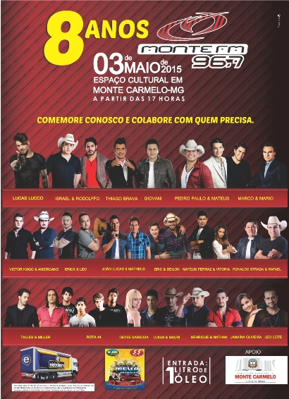 Na comemoração do 8° ano da Monte FM, 96,7 quem ganha um mega presente é a população de Monte Carmelo. A emissora caçula, do grupo “Sistema Difusora de Rádio”, vai trazer ao público carmelitano no dia 03 de Maio 2015, no Espaço Cultural, cerca de 18 atrações em um só palco. Isto mesmo que voce leu. Entre as quais, Lucas Lucco, Israel e Rodolfo, Thiago Brava, Thalles e Miller...O ingresso será um litro de óleo que será destinado á diversas entidades assistencias. Esta parceria entre o meio artístico e as emissora de rádio, possibilita este mix de atrações, com responsabilidade social e quem ganha, claro, o ouvinte. Bem no coração de Monte Carmelo. Confira !