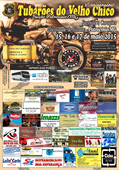 Os amantes da vida em duas rodas devem agendar: O moto clube TUBARÕES DO VELHO CHICO-FACCÃO PATROCÍNIO-MG, comemora o 3º aniversário com uma programação bem típica para os camaradas do bem. O evento acontecerá nos dias 15,15 e 17 de maio de 2015, na "Fazenda 4 Corações" (Propriedade da vereadora Drª Neusa Mendes) na localidade de Silvano. Ingressos: Motociclistas; R$15,00; Simpatizantes: R$ 20,00. Área de camping. Jantar na sexta-feira; café da manhã, churrasco e jantar no sábado e café da manhã domingo. Shows com as Bandas Alcatéia, Br 365, Monkira e demais feras do rock.Disque perdidão: (34)8831 000. (34) 9904 0707. Um evento regado a amizade, respeito e muita paixão pela máquina de dua rodas. Afinal: “Para os pássaros Deus deu duas asas, para o homem duas rodas”. "Lugar de homem e mulher é atras de do tanque...de uma moto".