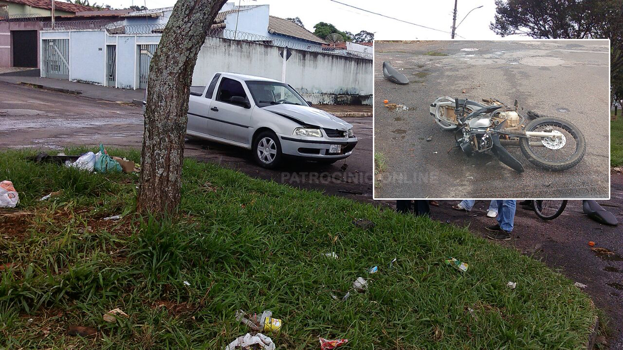 A motocicleta teve danos e o Saveiro ficou com a parte frontal toda danificada.