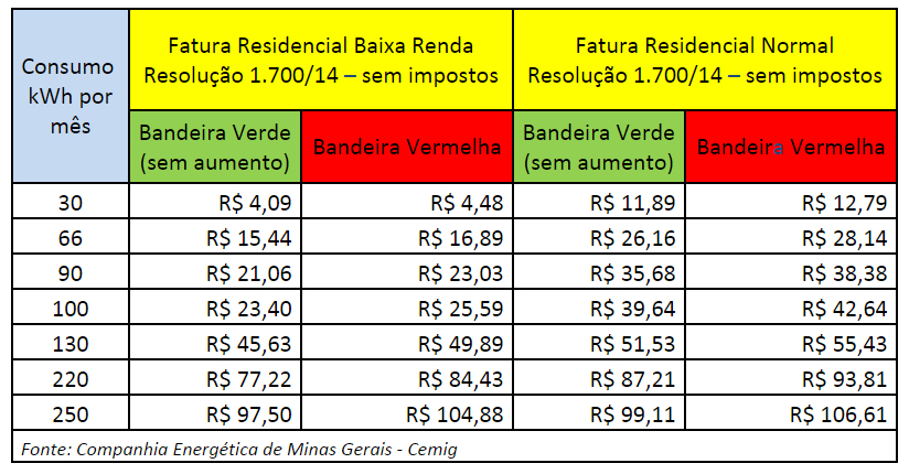 Desde junho de 2013, a Cemig avisa ao consumidor, por meio da Conta de Energia Elétrica, a bandeira tarifária que estaria em vigor no mês. Isso se deu em caráter de teste, com o objetivo de facilitar a compreensão do consumidor sobre esse novo sistema. Vale ressaltar que na Conta de Energia Elétrica não haverá nenhuma imagem de bandeira sinalizando a cor da tarifa vigente, mas será destacado, no campo "Valores Faturados", o custo adicional relativo à aplicação da bandeira tarifária vigente no período. Além disso, o consumidor poderá consultar, no site da Cemig e daAneel a Bandeira Tarifária vigente naquele mês.