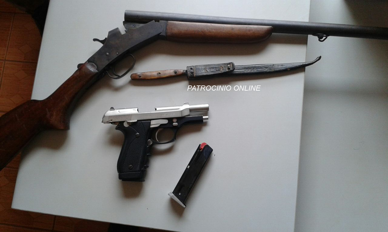 Em Monte Carmelo (MG), no dia 5, foi cumprido mandado de busca e apreensão de objetos, expedido pelo M.M. Juiz de Direito daquela comarca , na residência de R.F.D., 47 anos, na rua Minas Gerais, no bairro Belo Horizonte. Durante as buscas foram encontrados no guarda roupas uma pistola .380 marca Taurus, nº de série KHJ10778 com dois carregadores vazios, uma espingarda calibre 12 marca Rossi, nº de série 794606 e uma faca com bainha que estava em cima de uma mesa.