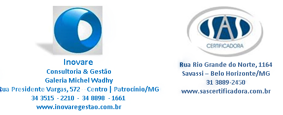 A Inovare Consultoria que tem como proprietária a Contadora e Consultora Cintia Monalisa de Lima em parceria com a empresa SAS Certificadora, sediada em Belo Horizonte/MG, convidam as empresas de Patrocínio/MG e região a participarem da Palestra no dia 16 de outubro de 2014 sobre Sistema de Gestão de Qualidade e Certificação das empresas na ISO 9001 e Sistemas Integrados e as novas alterações da ISO 9001/2015.