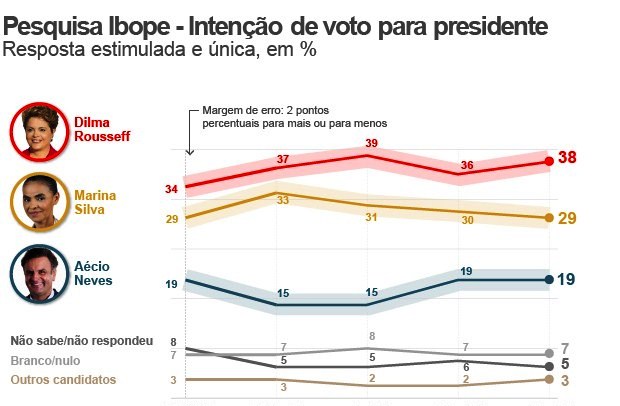 Pesquisa Ibope divulgada nesta terça-feira (23) aponta os seguintes percentuais de intenção de voto na corrida para a Presidência da República: