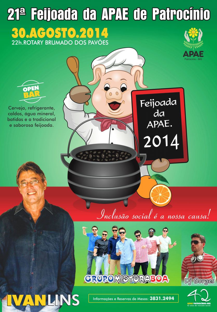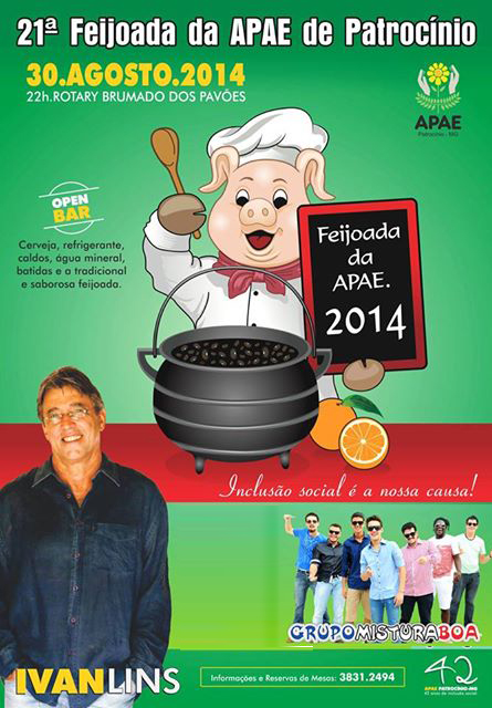 O objetivo do evento, Feijoada da APAE, realizado anualmente, é arrecadar recursos para o pagamento do 13º da folha de pagamento da entidade. Além do delicioso prato tipicamente brasileiro, muito elogiado pelos participantes, o evento mantém o alto nível na parte de atrações artísticas. Lembrando que nas edições anteriores da Feijoada da APAE, já se apresentaram em Patrocínio, Moacyr Franco, Renato Teixeira, Marciano, Osvaldo Montenegro, Guilherme Arantes e agora nesta edição 2014, além do Grupo patrocinense, Mistura Boa, e DJ Borges, está confirmada a presença do cantor Ivan Lins. Da década de 80 até os dias de hoje, um dos maiores ícones da MPB.