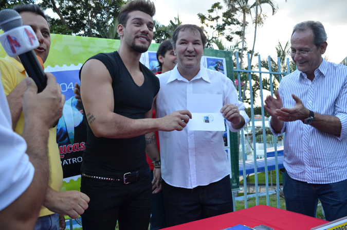 O gerente dos Correios, Edson Silva e o funcionário José Romes, ao lado de autoridades,familiares, imprensa e fãs, realizou o lançamento do comemorativo em homenagem ao cantor Lucas Lucco, que grava sue primeiro DVD no dia 7 de abril, aniversário de sua terra natal, Patrocínio.