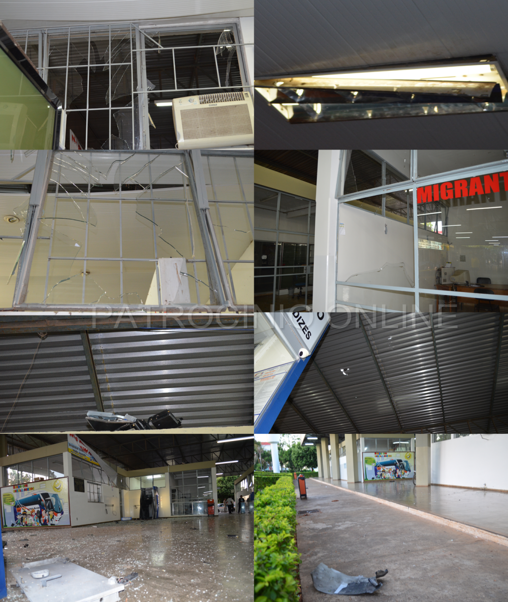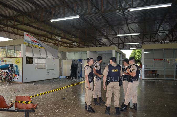 O funcionário da empresa de ônibus assaltada correu para uma sala ao lado, já que o guichê fica do lado da explosão e vidros do local foram estilhaçados, tanto do lado de dentro, quanto do lado de fora.