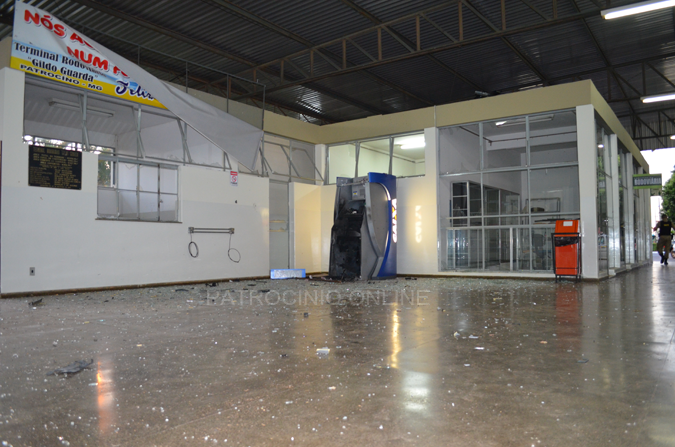 O visor do Caixa Eletronico com a força da explosão foi jogado em cima de uma laje. Pedaços do Caixa foram espalhos pela saguão do Terminal Rodoviário de Patrocínio, como a porta traseira com a tranca, que foi parar próximo ao loal em que se assentam os passageiros..