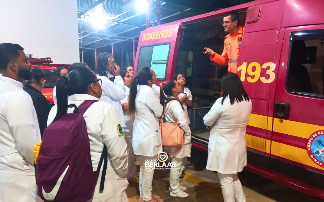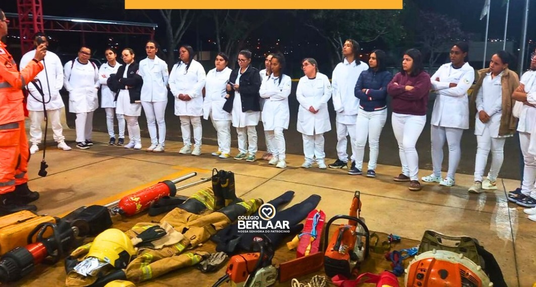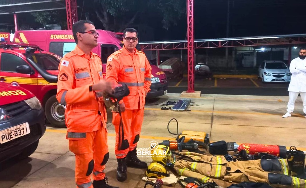 A visita ao Corpo de Bombeiros teve como objetivo proporcionar aos alunos do Colégio Berlaar uma demonstração prática de primeiros socorros, técnicas de imobilização, transporte de vítimas e atendimento em casos específicos, como afogamentos, acidentes com produtos tóxicos em caminhões pesados e incêndios.
