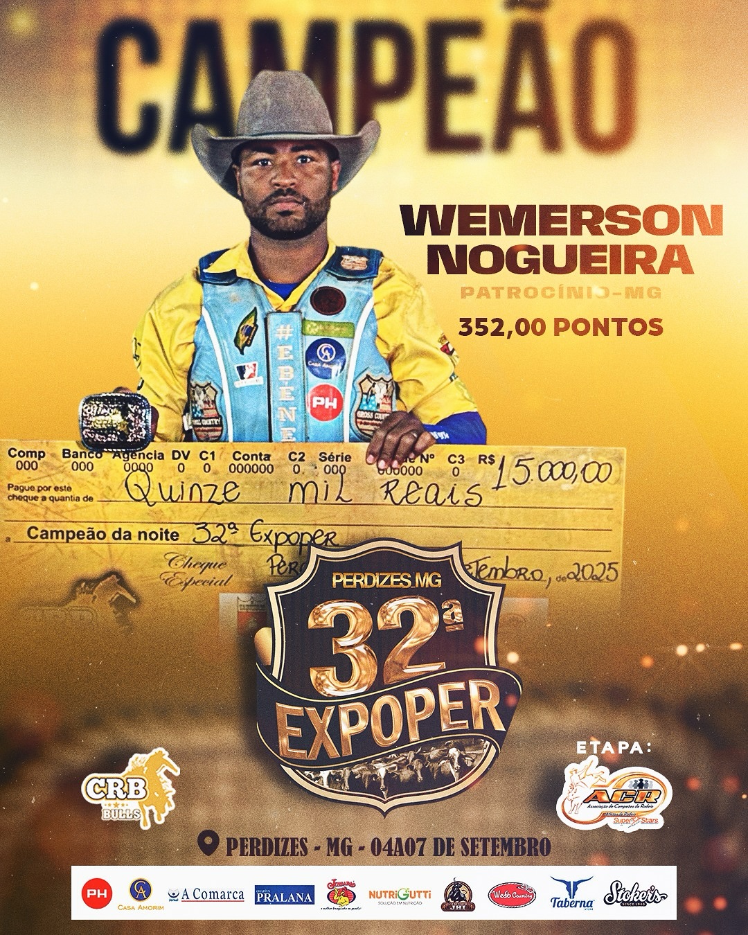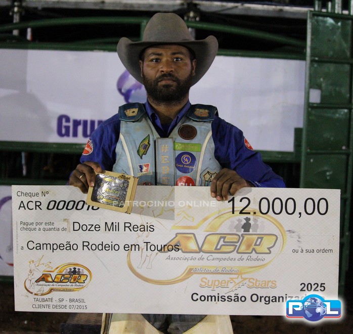 O patrocinense Wemerson Nogueira Alves, mais conhecido como Torim, brilhou na Festa do Peão de Cachoeira Alta 2025 e foi campeão do rodeio, que aconteceu na cidade de Cachoeira Alta, no estado de Goiás.