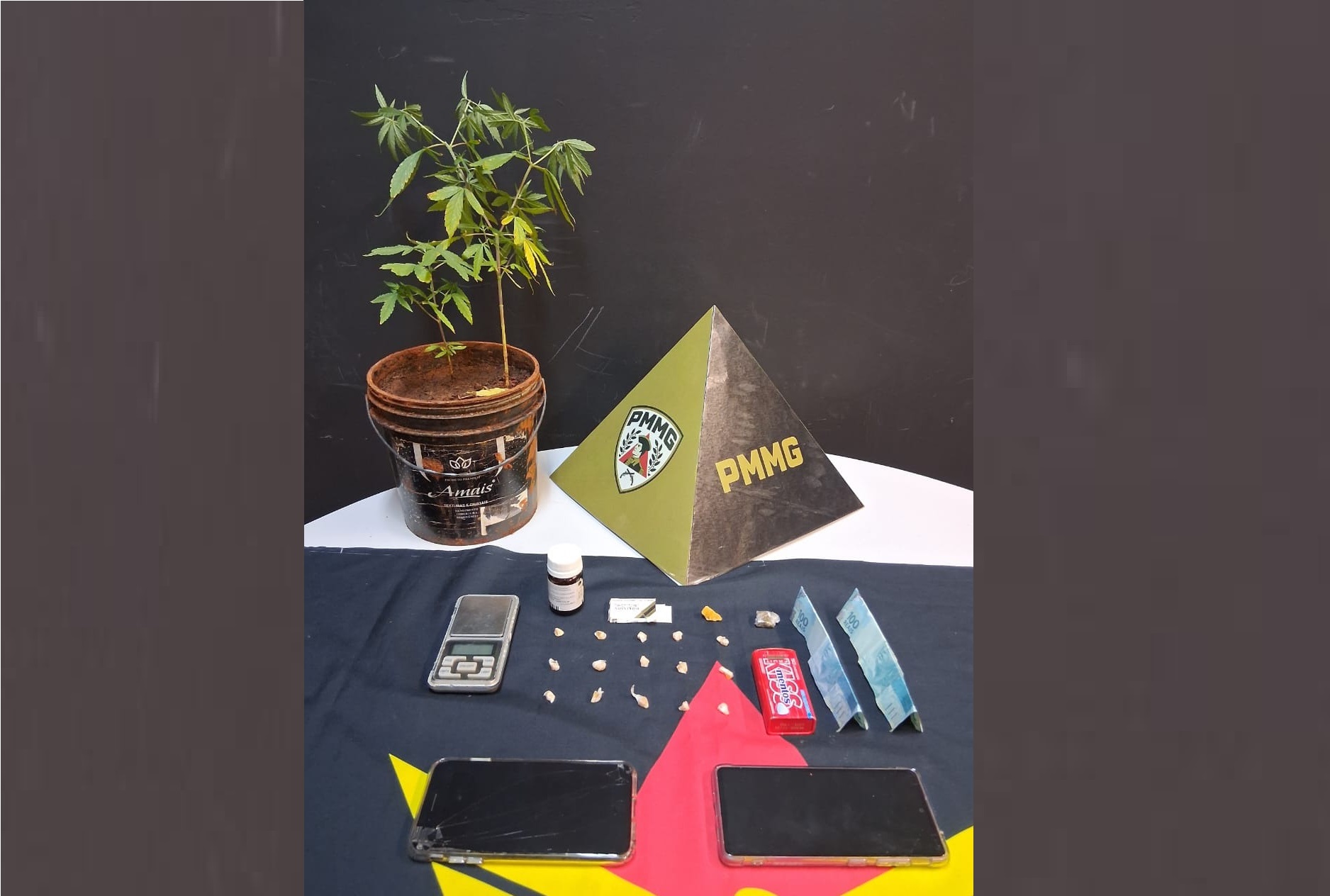 Os militares durante buscas eles encontraram uma pedra grande de crack (que poderia ser fracionada em até 8 porções), 15 pedras de crack tamnho comercial, uma balança de precisão, uma caixa de Gilletes lâminas utilizadas para o corte da droga e dois pés de maconha.