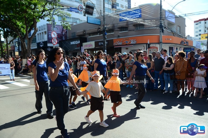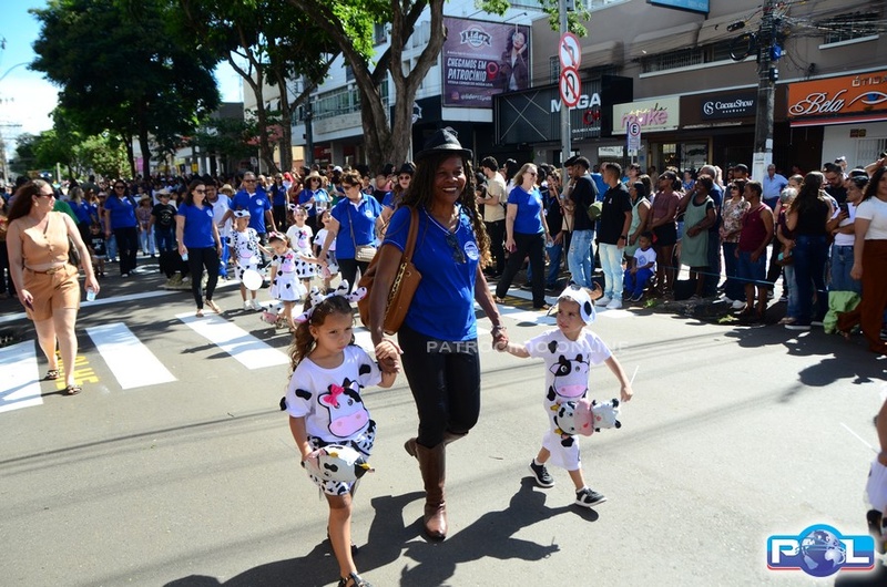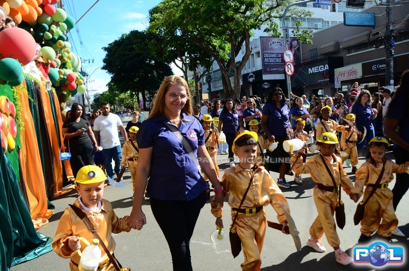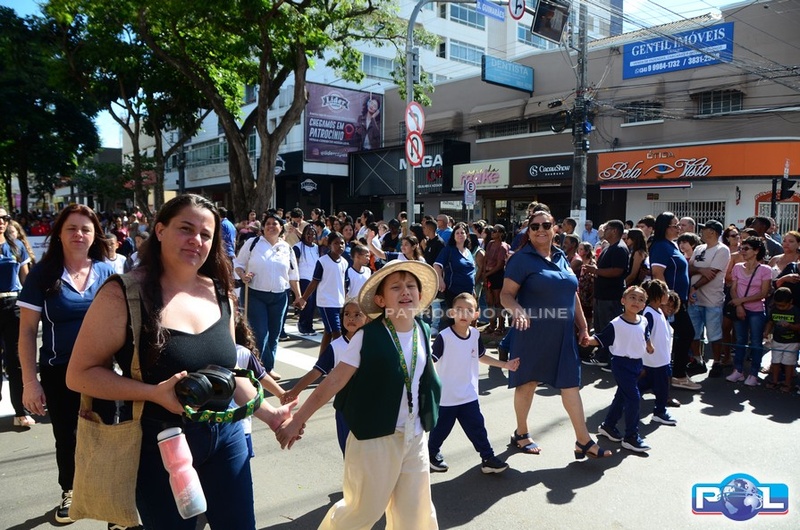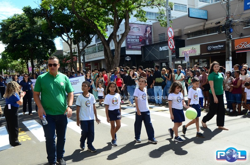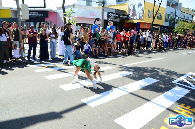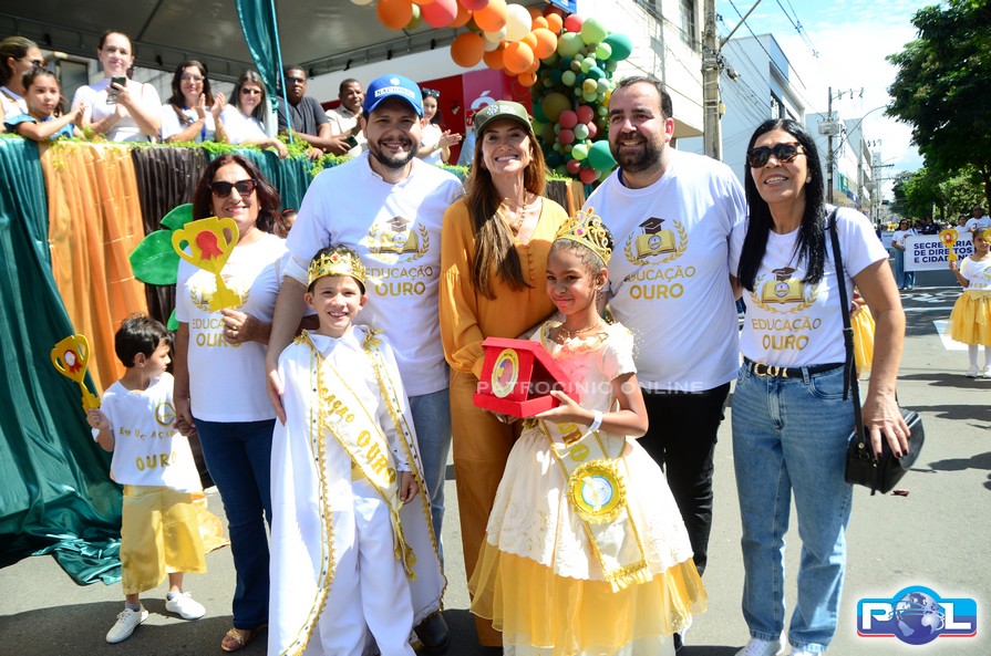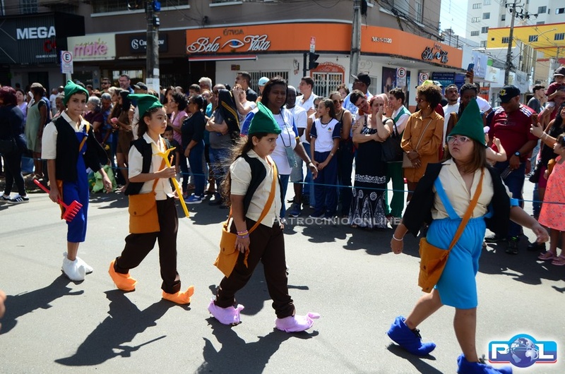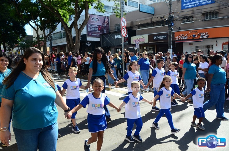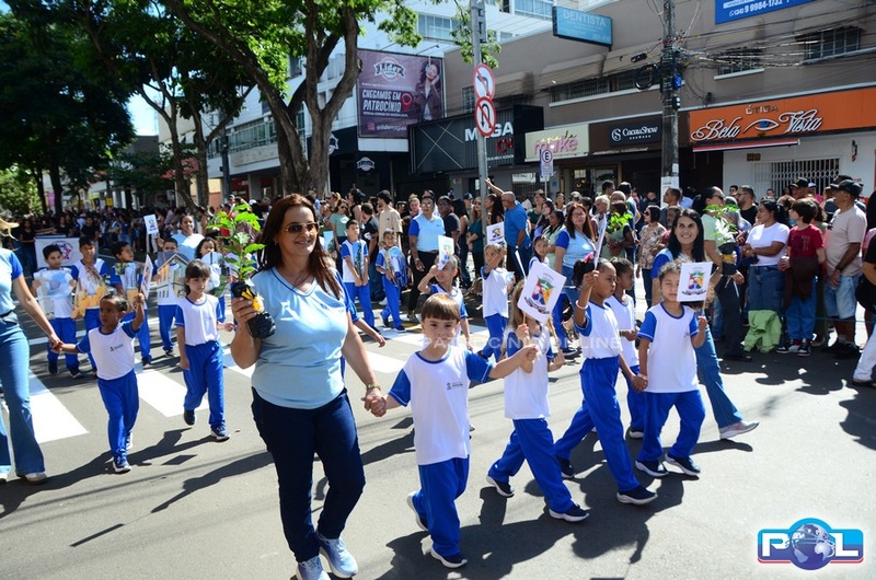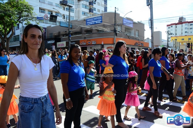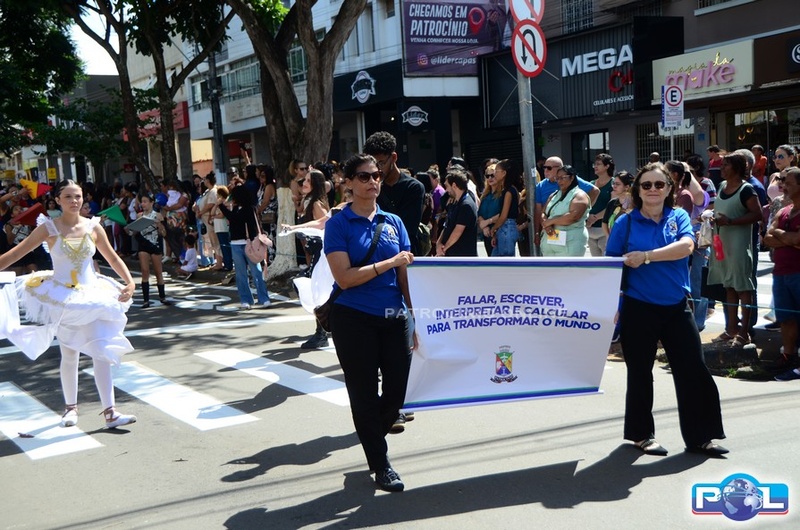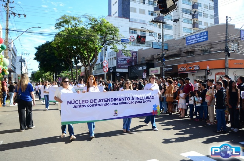 A educação teve destaque no desfile, com a participação de projetos e núcleos da rede municipal, evidenciando ações nas áreas de alfabetização, ensino especializado, línguas, ciências, artes, esportes e tecnologia.