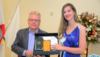 Após a palestra, Marcos Pontes recebeu uma pequena lembrança do presidente Célio Machado e dos Conselheiros de Administração e Fiscal.