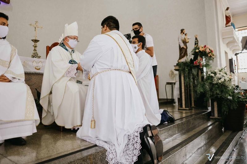 O ordenado recebeu a estola sacerdotal com o auxílio do Monsenhor Izael que o acompanhou desde a Comunidade Santo Antônio e a Paróquia São José o mesmo batizou e o padre Geraldo Magela após a Prece de Ordenação.