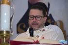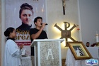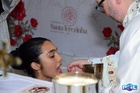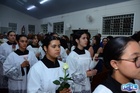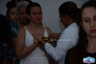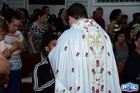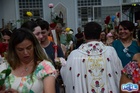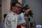 Após a homilia, Padre Marcelo abençoou a água e aspergiu as flores com água benta.